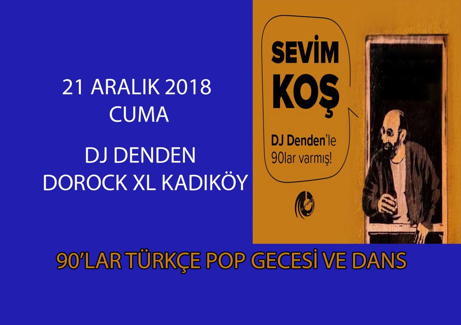 5 yıldır çeşitli mekanlarda 90’lar Türkçe Pop Müzik Gecesi yapan Ömürden Cengiz (Dj Denden), sizleri, 90’ların en güzel şarkılarıyla, eski dostlarınızla sınırsız eğlenceye davet ediyor. Sokaklarda kumdan baraj yapanlar, tetriste en uzun çubuğu sona bırakanlar, soba üstünde kestane yiyenler ve top kek sevenler.. Bu geceyi kaçırmayın.