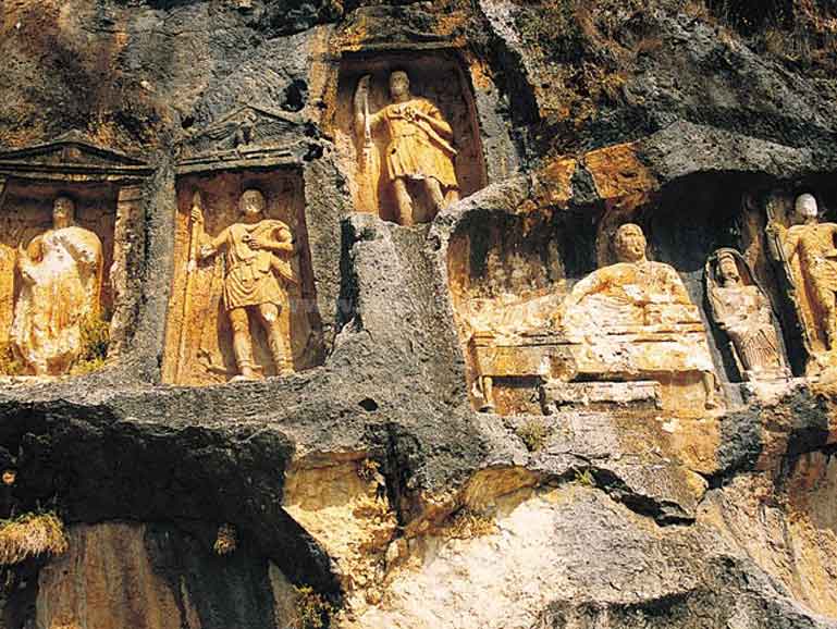 Adamkayalar olarak adlandırılan kaya kabartmaları, Mersin’in Erdemli ilçesinde, Şeytan Deresi Vadisi içinde yer alır. Korykos Antik Kenti surlarının yaklaşık 10 kilo metre kuzeyinde yer alan ve yönetici sınıfın anıt mezarları niteliğindeki Adamkayalar, dönemin günlük yaşantısına ışık tutan 11 adet rölyeften oluşmaktadır. Adamkayalar kabartmaları, sahnelerin altında bulunan ve ölen rahiplerin adlarının yazıldığı anlaşılan yazıtların incelenmesi sonucunda MÖ 2. yüzyıla tarihlendirilmiştir.