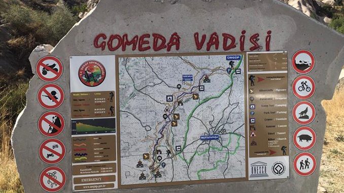 Mustafapaşa’nın batısında yer alan Gomeda Vadisi morfolojik açıdan Ihlara Vadisi’nin küçük bir benzeridir. Ihlara Vadisi’nde olduğu gibi kaya oyma kiliselere, barınaklara ve vadinin içinden geçen bir dereye sahiptir.
