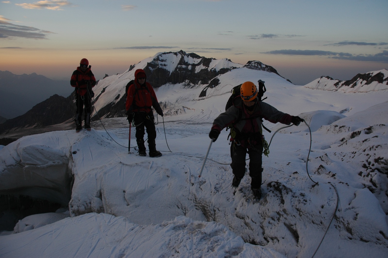 Gece 03.00’te zirve tırmanışı için kamptan hareket edilir. Buzul üzerinde ilerlenerek Kazbek Dağı’nın klasik zirve rotası takip edilir.